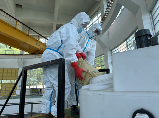 此次演練圍繞原水油跡污染及pH異常偏低兩個場景展開。演練中,發(fā)現“取水口出現少量油跡污染”后,吸水泵房巡檢人員立即上報并警戒現場,應急小組迅速攜帶攔油網、吸油毯趕赴現場,30分鐘內完成油污攔截與吸附,快速控制污染。隨后模擬原水pH值為6.3時,吸水泵房應急加藥系統(tǒng)迅速啟動,現場處置組協同配置藥劑、調試設備,精準投加調節(jié),不到1小時即讓水質穩(wěn)定在安全范圍。演練過程中,吸水泵房作為一線處置陣地,及時啟動應急預案,確保取水水質符合生產要求。同時,將觀洞水庫作為備用水源隨時待命,形成“即戰(zhàn)即防”的堅實防線。
