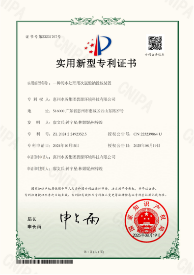 繼連續(xù)斬獲四項污水、污泥處理相關(guān)技術(shù)專利后,惠州水務(wù)集團碧源公司在水務(wù)環(huán)保技術(shù)創(chuàng)新領(lǐng)域再傳捷報。8月19日,由碧源公司自主研發(fā)的“一種污水處理用次氯酸鈉投放裝置”榮獲國家知識產(chǎn)權(quán)局授予專利權(quán)并頒發(fā)實用新型專利證書。至此,公司已在水務(wù)環(huán)保領(lǐng)域累計斬獲五項國家授權(quán)專利,涵蓋污水、污泥處理等多個關(guān)鍵技術(shù)環(huán)節(jié)。